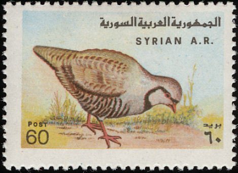Visibility: public Image owner: none postage 4/18/1978 60p multi dt=birds (1978 Syria) d=Alectoris chukar unwmk Crops No visible images cropped from this one. Measurements Resolution is unknown. Source Source name: Colnect File URL: http://i.colnect.net/b/1650/753/Chukar-Partridge-Alectoris-chukar.jpg Uploaded September 11, 2014, 10:35 pm by Stan Shebs |
