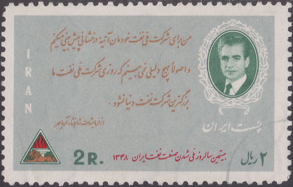 Visibility: public Image owner: none postage 3/20/1970 2r multi issue=20th Anniversary of the Nationalized Iranian oil Industry wmk=arms of Iran in circle perf=10.5 Crops No visible images cropped from this one. Measurements Resolution is unknown. Source Source name: Colnect File URL: http://i.colnect.net/images/b/1716/295/Nationalization-decree--portrait-of-the-Shah-in-the-medallio.jpg Uploaded September 11, 2014, 10:48 pm by Stan Shebs |