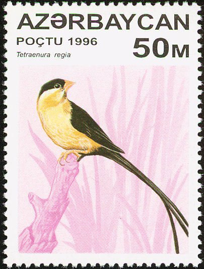 Visibility: public Image owner: none postage 6/19/1996 50m ultra issue=Birds 1996 dt=birds (1996 Azerbaijan) d=Tetraenura regia unwmk Crops No visible images cropped from this one. Measurements Resolution is unknown. Source Source name: Colnect File URL: http://i.colnect.net/b/1072/899/Shaft-tailed-Whydah-Tetraenura-regia.jpg Uploaded September 12, 2014, 1:13 pm by Stan Shebs |