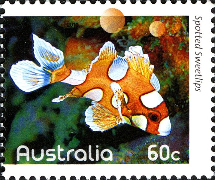 Visibility: public Image owner: none postage 6/21/2010 60c multi issue=Fishes of the Reef I dt=fishes (2010 Australia) d=Spotted Sweetlips unwmk perf=14x14.5 Crops No visible images cropped from this one. Measurements Resolution is unknown. Source Source name: Colnect File URL: http://i.colnect.net/b/910/743/Spotted-Sweetlips-Plectorhinchus-chaetodonoides-juvenile.jpg Uploaded September 13, 2014, 3:01 pm by Stan Shebs |
