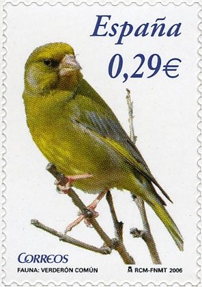 Visibility: public Image owner: none postage 7/5/2006 0,29€ multi issue=Flora and Fauna d=European greenfinch unwmk Crops No visible images cropped from this one. Measurements Resolution is unknown. Source Source name: Colnect File URL: http://i.colnect.net/b/581/662/European-Greenfinch-Carduelis-chloris.jpg Uploaded August 29, 2013, 11:00 pm by Stan Shebs |