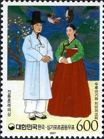 Visibility: public Image owner: none postage 3/30/2007 600w multi issue=Korea-Singapore Joint Issue dt=traditional wedding costumes d=Durumagi & Chima/Jeogon unwmk Crops No visible images cropped from this one. Measurements Resolution is unknown. Source Source name: Colnect File URL: http://i.colnect.net/b/1604/739/Traditional-Wedding-Costumes---Durumagi---Chima-Jeogon.jpg Uploaded September 15, 2014, 7:40 pm by Stan Shebs |