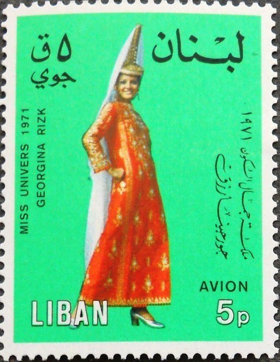 Visibility: public Image owner: none airmail 12/21/1974 5pia multi issue=Miss Universe 1971 d=Georgina Rizk in libanese costume unwmk Crops No visible images cropped from this one. Measurements Resolution is unknown. Source Source name: Colnect File URL: http://i.colnect.net/images/b/1382/598/Georgina-Rizk-in-libanese-costume.jpg Uploaded September 15, 2014, 8:34 pm by Stan Shebs |