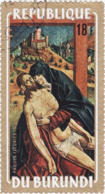 Visibility: public Image owner: none postage 3/20/1972 18fr multi issue=Easter 1972 d="Pieta" - Gallegos unwmk Crops No visible images cropped from this one. Measurements Resolution is unknown. Source Source name: Colnect File URL: http://i.colnect.net/images/b/1112/693/F-Gallego--Pieta.jpg Uploaded September 15, 2014, 9:33 pm by Stan Shebs |