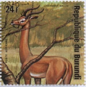 Visibility: public Image owner: none airmail 9/17/1975 24fr multi dt=African Animals (1975) d=Litocranius walleri (1975) unwmk Crops No visible images cropped from this one. Measurements Resolution is unknown. Source Source name: Colnect File URL: http://i.colnect.net/images/b/1324/121/Gerenuk-Lithocranius-walleri.jpg Uploaded September 15, 2014, 9:36 pm by Stan Shebs |