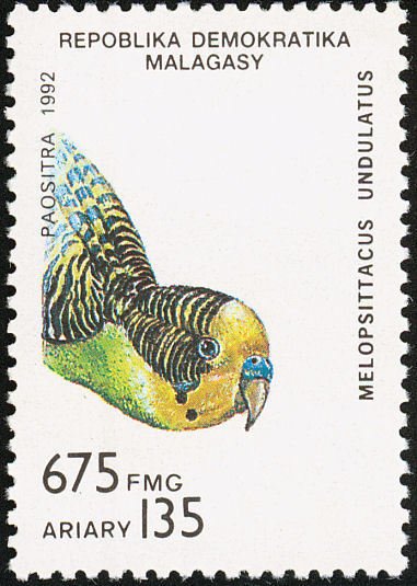Visibility: public Image owner: none postage 2/24/1993 675fr multi issue=Parrots 1993 dt=parrots (1993) d=Melopsittacus undulatus (1993 Madagascar) unwmk Crops No visible images cropped from this one. Measurements Resolution is unknown. Source Source name: Colnect File URL: http://i.colnect.net/b/1458/023/Budgerigar-Melopsittacus-undulatus.jpg Uploaded September 15, 2014, 10:48 pm by Stan Shebs |