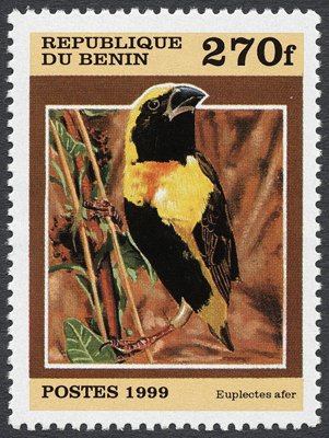 Visibility: public Image owner: none postage 1/10/1999 270f multi issue=Birds 1999 d=Euplectes afer unwmk Crops No visible images cropped from this one. Measurements Resolution is unknown. Source Source name: Colnect File URL: http://i.colnect.net/b/854/788/Yellow-crowned-Bishop-Euplectes-afer.jpg Uploaded September 16, 2014, 1:23 pm by Stan Shebs |