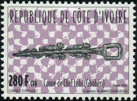 Visibility: public Image owner: none postage 9/20/1996 280fr multi issue=Ceremonial Sticks unwmk Crops No visible images cropped from this one. Measurements Resolution is unknown. Source Source name: Colnect File URL: http://i.colnect.net/b/1055/812/Ceremonial-cane---Cane-Head-Lobi-Gbobéri.jpg Uploaded September 16, 2014, 3:08 pm by Stan Shebs |