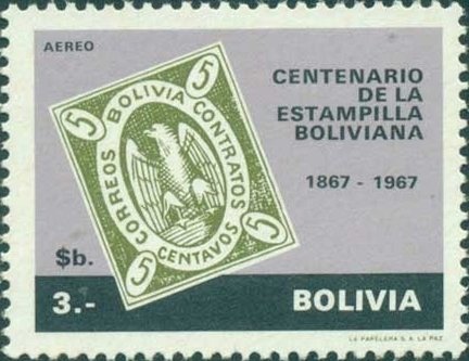 Visibility: public Image owner: none airmail 12/23/1968 3.00b multi issue=Bolivian stamp 100th unwmk Crops No visible images cropped from this one. Measurements Resolution is unknown. Source Source name: Colnect File URL: http://i.colnect.net/b/1691/285/100-Years-of-Bolivian-postage-stamps.jpg Uploaded September 16, 2014, 4:48 pm by Stan Shebs |