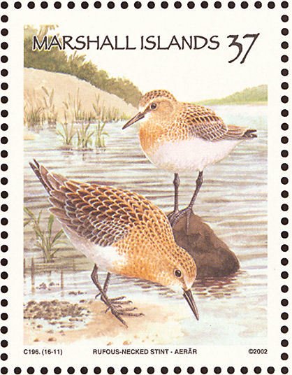 Visibility: public Image owner: none postage 5/29/2002 37c multi issue=Birds 2002 dt=birds (2002 Marshall Islands) d=Calidris ruficollis unwmk perf=13.5 Crops No visible images cropped from this one. Measurements Resolution is unknown. Source Source name: Colnect File URL: http://i.colnect.net/b/1599/563/Red-necked-Stint-Calidris-ruficollis.jpg Uploaded September 16, 2014, 6:15 pm by Stan Shebs |