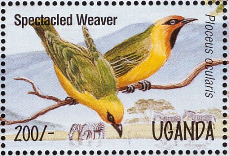 Visibility: public Image owner: none postage 4/24/1995 200sh multi issue=Waterfowl and Wetland Birds of Uganda d=spectacled weaver Ploceus ocularis unwmk perf=14 Crops No visible images cropped from this one. Measurements Resolution is unknown. Source Source name: Colnect File URL: http://i.colnect.net/b/1409/323/Spectacled-Weaver-Hyphanturgus-ocularis.jpg Uploaded September 16, 2014, 6:25 pm by Stan Shebs |