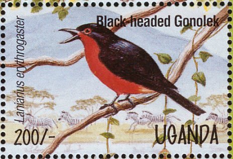 Visibility: public Image owner: none postage 4/24/1995 200sh multi issue=Waterfowl and Wetland Birds of Uganda d=black-headed gonolek Laniarius erythrogaster unwmk perf=14 Crops No visible images cropped from this one. Measurements Resolution is unknown. Source Source name: Colnect File URL: http://i.colnect.net/b/1409/324/Black-headed-Gonolek-Laniarius-erythrogaster-.jpg Uploaded September 16, 2014, 6:25 pm by Stan Shebs |