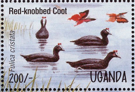 Visibility: public Image owner: none postage 4/24/1995 200sh multi issue=Waterfowl and Wetland Birds of Uganda d=Fulica cristata unwmk perf=14 Crops No visible images cropped from this one. Measurements Resolution is unknown. Source Source name: Colnect File URL: http://i.colnect.net/b/1409/326/Red-knobbed-Coot-Fulica-cristata.jpg Uploaded September 16, 2014, 6:25 pm by Stan Shebs |