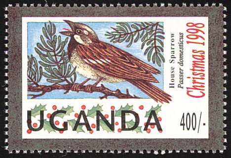Visibility: public Image owner: none postage 12/3/1998 400sh multi issue=Christmas 1998 dt=birds (1998 Uganda) d=Passer domesticus (1998) unwmk perf=14.25 Crops No visible images cropped from this one. Measurements Resolution is unknown. Source Source name: Colnect File URL: http://i.colnect.net/b/1409/335/House-Sparrow-Passer-domesticus.jpg Uploaded September 16, 2014, 6:29 pm by Stan Shebs |