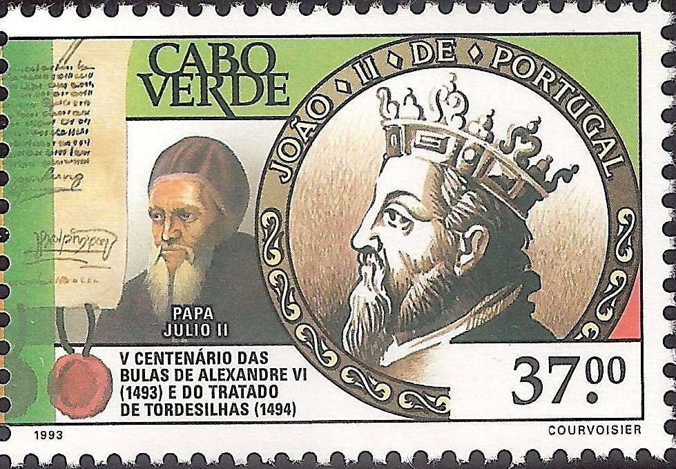 Visibility: public Image owner: none postage 8/1/1993 37e multi issue=500th Anniversary of Pope Alexander VI Bull d=King Joao II of Portugal and Pope Julius unwmk Crops No visible images cropped from this one. Measurements Resolution is unknown. Source Source name: Colnect File URL: http://i.colnect.net/images/b/1129/205/Treaty-of-Tordesillas.jpg Uploaded September 16, 2014, 7:44 pm by Stan Shebs |