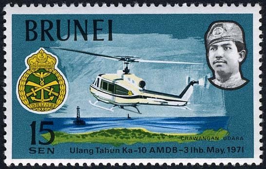 Visibility: public Image owner: none postage 5/31/1971 15c multi issue=Royal Brunei Malay Regiment 10th wmk=St Edwards crown & CA perf=14.5 Crops No visible images cropped from this one. Measurements Resolution is unknown. Source Source name: Colnect File URL: http://i.colnect.net/b/1597/385/Helicopter-and-Emblem.jpg Uploaded September 16, 2014, 8:03 pm by Stan Shebs |