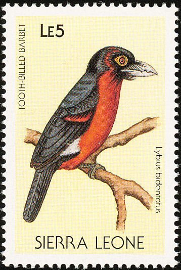 Visibility: public Image owner: none postage 6/25/1988 5le multi issue=Birds 1988 dt=birds (1988 Sierra Leone) d=Lybius bidentatus (1988) unwmk perf=14 Crops No visible images cropped from this one. Measurements Resolution is unknown. Source Source name: Colnect File URL: http://i.colnect.net/images/b/1618/025/Double-toothed-Barbet-Lybius-bidentatus.jpg Uploaded September 16, 2014, 10:45 pm by Stan Shebs |
