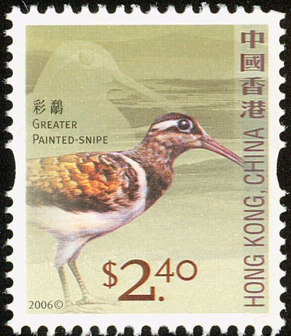 Visibility: public Image owner: none postage 12/31/2006 $2.40 multi issue=2006 dt=birds (2006 Hong Kong) d=greater painted-snipe unwmk Crops No visible images cropped from this one. Measurements Resolution is unknown. Source Source name: Colnect File URL: http://i.colnect.net/b/832/011/Greater-Painted-snipe-Rostratula-benghalensis.jpg Uploaded September 16, 2014, 11:33 pm by Stan Shebs |