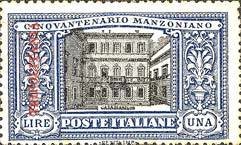 Visibility: public Image owner: none postage 4/1/1924 1l bl&blk issue=Manzoni d=Manzoni's house in Milan ovpt=TRIPOLITANIA oc=blk on=issuer=Italy-issue=Manzoni-1l wmk=crown (Italy) perf=14 Crops No visible images cropped from this one. Measurements Resolution is unknown. Source Source name: Colnect File URL: http://i.colnect.net/b/1628/279/50th-Memorial-Anniversary-of-Alessandro-Manzoni.jpg Uploaded September 17, 2014, 12:20 am by Stan Shebs |