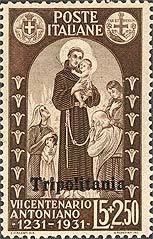 Visibility: public Image owner: none postage 5/7/1931 5l+2.50l brn issue=St Anthony of Padua d=Portrait of St Francis of Assisi ovpt=TRIPOLITANIA oc=blk on=issuer=Italy-5l+2.50l unwmk perf=14 Crops No visible images cropped from this one. Measurements Resolution is unknown. Source Source name: Colnect File URL: http://i.colnect.net/b/1628/339/Saint-Antony.jpg Uploaded September 17, 2014, 12:21 am by Stan Shebs |
