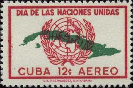 Visibility: public Image owner: none airmail 10/24/1957 12c rose&grn issue=UN Day 1957 d=UN emblem on map of Cuba perf=12.5 Crops No visible images cropped from this one. Measurements Resolution is unknown. Source Source name: Colnect File URL: http://i.colnect.net/images/b/209/084/United-Nations-Day.jpg Uploaded August 15, 2014, 4:48 pm by Stan Shebs |