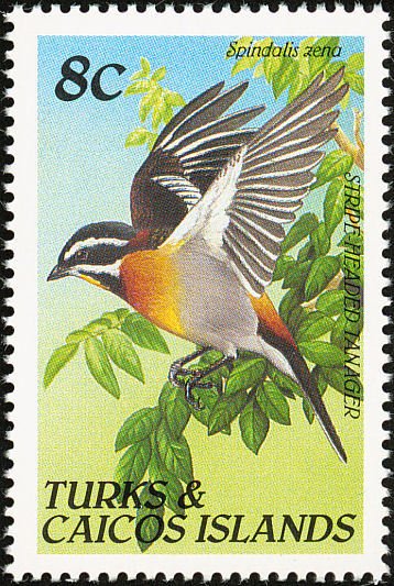 Visibility: public Image owner: none postage 9/24/1990 8c multi dt=birds (1990 Turks & Caicos Islands) d=Stripe Headed Tanager Spindalis zena wmk=mult crown & script CA perf=14 Crops No visible images cropped from this one. Measurements Resolution is unknown. Source Source name: Colnect File URL: http://i.colnect.net/b/1764/360/Western-Spindalis-Spindalis-zena.jpg Uploaded September 17, 2014, 1:24 pm by Stan Shebs |