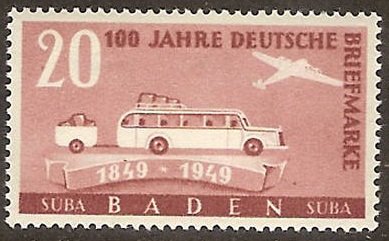 Visibility: public Image owner: none postage 9/17/1949 20pf redbrn issue=German stamp 100th d=post bus with trailer & plane unwmk Crops No visible images cropped from this one. Measurements Resolution is unknown. Source Source name: Colnect File URL: http://i.colnect.net/images/b/545/753/Postage-Bus.jpg Uploaded September 17, 2014, 1:58 pm by Stan Shebs |