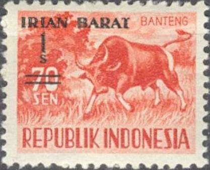 Visibility: public Image owner: none West Irian postage 5/1/1963 1s issue=provisional dt=animals (1958) d=bull (1958) ovpt=Irian Barat oc=blk on=issuer=Indonesia-1958-70s unwmk perf=12.5x13.5 Crops No visible images cropped from this one. Measurements Resolution is unknown. Source Source name: Colnect File URL: http://i.colnect.net/b/1162/666/Banteng-Bos-javanicus---Overprinted-`Irian-Barat`.jpg Uploaded August 15, 2014, 8:34 pm by Stan Shebs |
