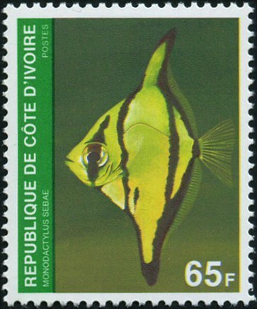 Visibility: public Image owner: none postage 4/19/1980 65fr multi dt=fishes (1980 Ivory Coast) d=Monodactylus sebae unwmk Crops No visible images cropped from this one. Measurements Resolution is unknown. Source Source name: Colnect File URL: http://i.colnect.net/b/955/416/African-Moony-Monodactylus-sebae.jpg Uploaded August 15, 2014, 9:15 pm by Stan Shebs |