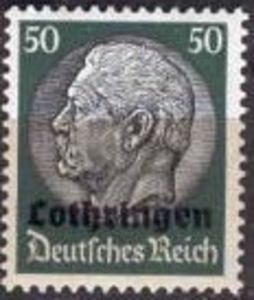 Visibility: public Image owner: none postage 50pf grn&grayblk issue=1940 d=Hindenburg (profile) ovpt=Lothringen oc=blk on=issuer=Germany-issue=1933-50pf wmk=network perf=14 Crops No visible images cropped from this one. Measurements Resolution is unknown. Source Source name: Colnect (old) File URL: http://i.colnect.net/images/f/547/215/Overprint-LOTHRINGEN-Over-Hindenburg.jpg Uploaded August 26, 2012, 6:06 am by Stan Shebs |