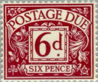 Visibility: public Image owner: none postage due 3/29/1962 6p pur issue=1959 due d=numeral (1914 Great Britain) wmk=St Edwards crown mult perf=14x15 Crops No visible images cropped from this one. Measurements Resolution is unknown. Source Source name: Colnect File URL: http://i.colnect.net/b/123/677/Postage-Due.jpg Uploaded August 16, 2014, 1:05 pm by Stan Shebs |