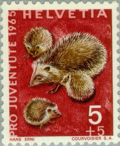 Visibility: public Image owner: none semipostal 12/1/1965 5+5(c) multi issue=Pro Juventute 1965 dt=animals (1965 Switzerland) d=Erinaceus europaeus (1965) unwmk perf=11.5 Crops No visible images cropped from this one. Measurements Resolution is unknown. Source Source name: Colnect File URL: http://i.colnect.net/images/b/140/279/European-Hedgehog-Erinaceus-europaeus.jpg Uploaded August 16, 2014, 2:40 pm by Stan Shebs |