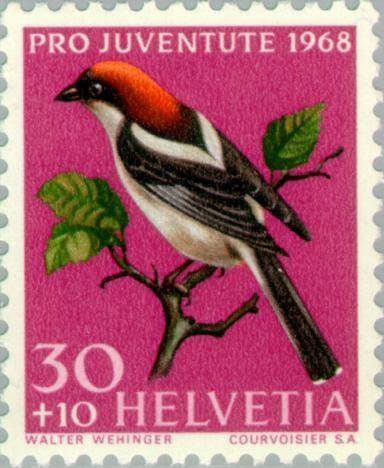 Visibility: public Image owner: none semipostal 11/28/1968 30+10(c) pnk&multi issue=Pro Juventute 1968 dt=birds (1968 Switzerland) d=Lanius senator (1968) unwmk Crops No visible images cropped from this one. Measurements Resolution is unknown. Source Source name: Colnect File URL: http://i.colnect.net/images/b/140/361/Woodchat-Shrike-Lanius-senator.jpg Uploaded September 2, 2012, 4:10 pm by Stan Shebs |