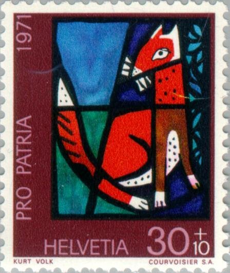 Visibility: public Image owner: none semipostal 5/27/1971 30+10(c) multi issue=Pro Patria 1971 dt=stained glass windows (1971 Switzerland) d=Fox by K Volk unwmk Crops No visible images cropped from this one. Measurements Resolution is unknown. Source Source name: Colnect File URL: http://i.colnect.net/images/b/140/435/-quot-Fox-quot--by-K-Volk.jpg Uploaded August 16, 2014, 2:45 pm by Stan Shebs |