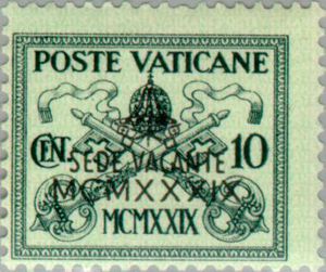 Visibility: public Image owner: none postage 2/20/1939 10c dkgrn<grn issue=interregnum 1939 d=papal arms (1929) ovpt=SEDE VACANTE//MCMXXXIX oc=blk on=1929-10c unwmk perf=14 Crops No visible images cropped from this one. Measurements Resolution is unknown. Source Source name: Colnect (old) File URL: http://i.colnect.net/images/f/150/373/Pope-Pius-XI--Decease.jpg Uploaded September 6, 2012, 5:12 am by Stan Shebs |