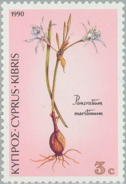 Visibility: public Image owner: none postage 11/5/1990 3c multi dt=flowers (1990 Cyprus) d=Pancratium maritimum (1990) wmk=mult crown & script CA Crops No visible images cropped from this one. Measurements Resolution is unknown. Source Source name: Colnect File URL: http://i.colnect.net/b/177/656/Pancratium-maritimum---Sea-Daffodil.jpg Uploaded August 16, 2014, 6:21 pm by Stan Shebs |