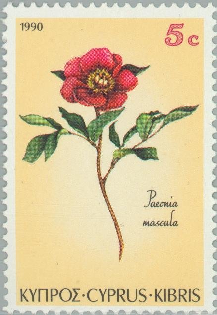 Visibility: public Image owner: none postage 11/5/1990 5c multi dt=flowers (1990 Cyprus) d=Paeonia mascula (1990) wmk=mult crown & script CA Crops No visible images cropped from this one. Measurements Resolution is unknown. Source Source name: Colnect File URL: http://i.colnect.net/b/177/657/Paeonia-mascula---Wild-Peony.jpg Uploaded August 16, 2014, 6:21 pm by Stan Shebs |