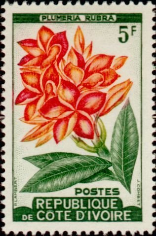 Visibility: public Image owner: none postage 9/30/1961 5fr multi dt=flowers (1961 Ivory Coast) d=Plumeria rubra (1961) unwmk Crops No visible images cropped from this one. Measurements Resolution is unknown. Source Source name: Colnect File URL: http://i.colnect.net/b/955/370/Plumeria-rubra.jpg Uploaded August 16, 2014, 6:26 pm by Stan Shebs |