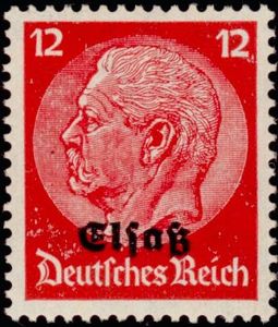 Visibility: public Image owner: none German occupation of Alsace postage 12pf car issue=1940 d=Hindenburg (profile) ovpt=Elsasz oc=blk on=issuer=Germany-issue=1933-12pf wmk=network perf=14 Crops No visible images cropped from this one. Measurements Resolution is unknown. Source Source name: Colnect (old) File URL: http://i.colnect.net/images/f/1042/391/Hindenburg-surcharg-eacute---quot-Elsa-szlig--quot-.jpg Uploaded September 8, 2012, 11:41 pm by Stan Shebs |