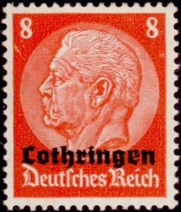 Visibility: public Image owner: none German occupation of Lorraine postage 8pf redorg issue=1940 d=Hindenburg (profile) ovpt=Lothringen oc=blk on=issuer=Germany-issue=1933-8pf wmk=network perf=14 Crops No visible images cropped from this one. Measurements Resolution is unknown. Source Source name: Colnect (old) File URL: http://i.colnect.net/images/f/1042/423/Hindenburg-surcharg-eacute---quot-Lothringen-quot-.jpg Uploaded September 8, 2012, 11:42 pm by Stan Shebs |