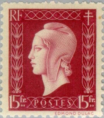 Visibility: public Image owner: none postage 12/1944 15fr issue=1944b d=Marianne (de Dulac) unwmk Crops No visible images cropped from this one. Measurements Resolution is unknown. Source Source name: Colnect File URL: http://i.colnect.net/images/b/143/572/Marianne-type-Dulac.jpg Uploaded August 16, 2014, 8:30 pm by Stan Shebs |