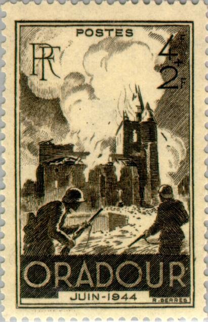 Visibility: public Image owner: none semipostal 10/13/1945 4fr+2fr d=Oradour church burning unwmk perf=13 Crops No visible images cropped from this one. Measurements Resolution is unknown. Source Source name: Colnect File URL: http://i.colnect.net/images/b/143/581/Oradour---June-1944.jpg Uploaded August 16, 2014, 8:34 pm by Stan Shebs |
