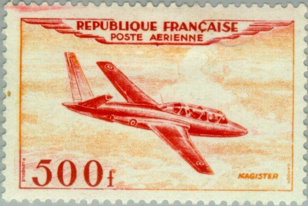 Visibility: public Image owner: none airmail 1/16/1954 500fr issue=1954 air unwmk perf=13 Crops No visible images cropped from this one. Measurements Resolution is unknown. Source Source name: Colnect File URL: http://i.colnect.net/images/b/143/857/Fouga-Magister.jpg Uploaded August 16, 2014, 8:54 pm by Stan Shebs |