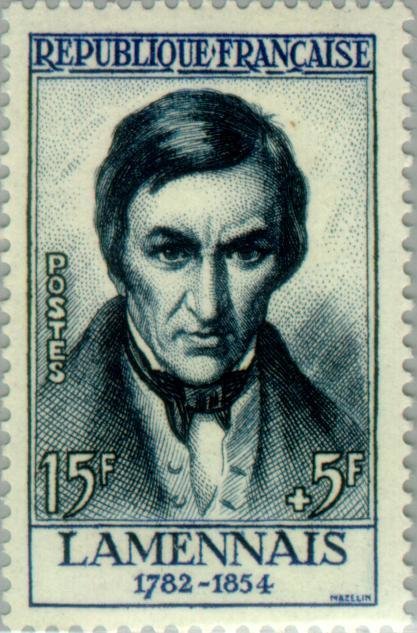 Visibility: public Image owner: none semipostal 6/15/1957 15+5fr dkbl&bl issue=1957 semi dt=Famous Frenchmen (1956) d=Lamennais unwmk perf=13 Crops No visible images cropped from this one. Measurements Resolution is unknown. Source Source name: Colnect File URL: http://i.colnect.net/images/b/144/037/Lamennais-Felicite-Robert-de-1782-1854.jpg Uploaded August 16, 2014, 9:09 pm by Stan Shebs |