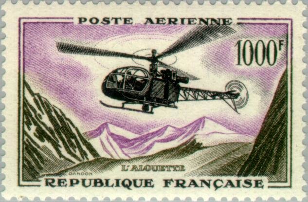 Visibility: public Image owner: none airmail 1/11/1958 1000fr multi issue=1957 air unwmk perf=13 Crops No visible images cropped from this one. Measurements Resolution is unknown. Source Source name: Colnect File URL: http://i.colnect.net/images/b/144/013/Alouette-Helicopter.jpg Uploaded August 17, 2014, 6:30 am by Stan Shebs |
