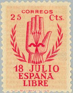 Visibility: public Image owner: none postage 7/17/1938 25c car&rose issue=Alzamiento 2nd unwmk perf=14 Crops No visible images cropped from this one. Measurements Resolution is unknown. Source Source name: Colnect (old) File URL: http://i.colnect.net/images/f/167/784/Falange--symbool.jpg Uploaded September 10, 2012, 7:04 pm by Stan Shebs |