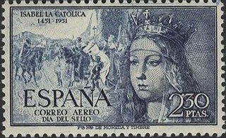 Visibility: public Image owner: none airmail 10/12/1951 2.30p issue=Stamp Day 1951 d=The Capitulation of Granada & Isabel the Catholic unwmk perf=12.75x13 Crops No visible images cropped from this one. Measurements Resolution is unknown. Source Source name: Colnect File URL: http://i.colnect.net/b/456/696/Isabel-the-Catholic.jpg Uploaded September 10, 2012, 10:38 pm by Stan Shebs |