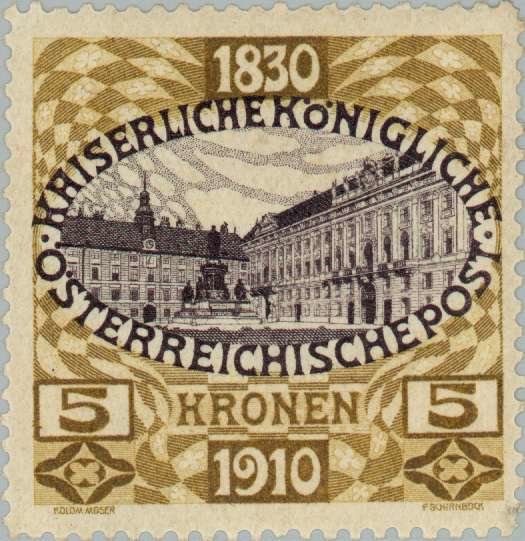 Visibility: public Image owner: none postage 8/18/1910 5kr olbrn&blkvio issue=Franz Josef 80th d=Vienna Hofburg unwmk perf=9-12.5 Crops No visible images cropped from this one. Measurements Resolution is unknown. Source Source name: Colnect File URL: http://i.colnect.net/b/135/447/Vienna-Hofburg.jpg Uploaded August 17, 2014, 1:48 pm by Stan Shebs |