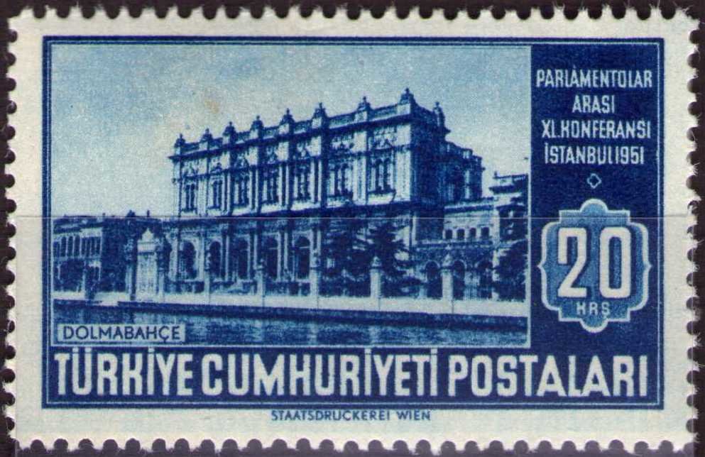 Visibility: public Image owner: none postage 8/31/1951 20k dkbl issue=40th Inter-parliamentary conference d=Dolmabahçe Palace unwmk Crops No visible images cropped from this one. Measurements Resolution is unknown. Source Source name: Colnect File URL: http://i.colnect.net/b/724/311/-Dolmabahçe--Palace.jpg Uploaded August 17, 2014, 10:25 pm by Stan Shebs |