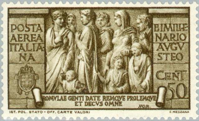 Visibility: public Image owner: none airmail 9/23/1937 50c brn issue=Augustus 2000th wmk=crown (Italy) perf=14 Crops No visible images cropped from this one. Measurements Resolution is unknown. Source Source name: Colnect File URL: http://i.colnect.net/b/188/200/Prosperity-of-the-Roman.jpg Uploaded August 18, 2014, 3:51 pm by Stan Shebs |